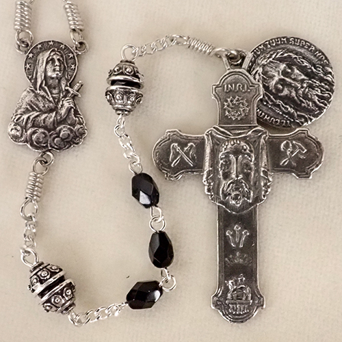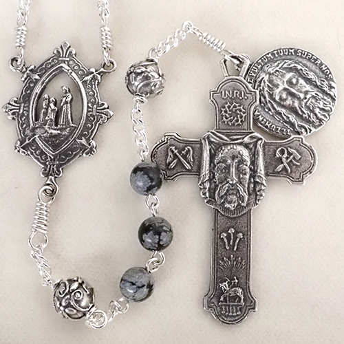The chaplet of the Holy Face was given to Sister Mary of St. Peter by Our Lord Himself, for the triumph of the Church and the downfall of Her enemies, especially Communism. The prayer said on the individual beads consists of the opening words of the 67th psalm: “Let God arise, and let His enemies be scattered. Let them that hate Him flee from before His face.” It is a battle cry, the prayer that proceeded the Ark of the Covenant whenever Moses set out against the enemies of God. St. Athanasius relates that the devils, on being asked what verse in the whole Scripture they feared most replied with this phrase, adding that it always compels them to take flight. We have long offered Holy Face chaplets but recently added new vintage designs, including new sterling silver ones.