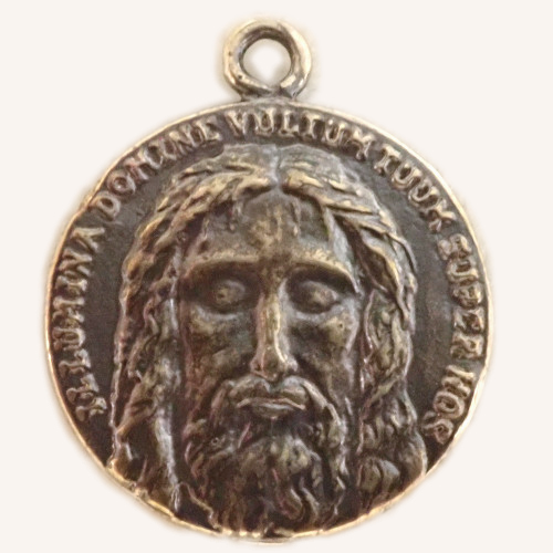 For the next 75 years, additional copies were made of the veil in the same manner and sent to churches and convents in order to promote and spread the devotion. This is the story behind our own image the veil’s image of the Holy Face in our own oratory. It is one of those early original drawings from the miracle. As we mentioned in our past newsletter, we received it as a gift from a good friend of our Community, and it bears the personal seal of Pope Pius IX. It is from this very image that we make the ancient Holy Face plaques that we offer to you. And today, as we begin The Holy Forty Days of Lent, we present a new relic badge. But the story behind the new badge goes a little deeper.