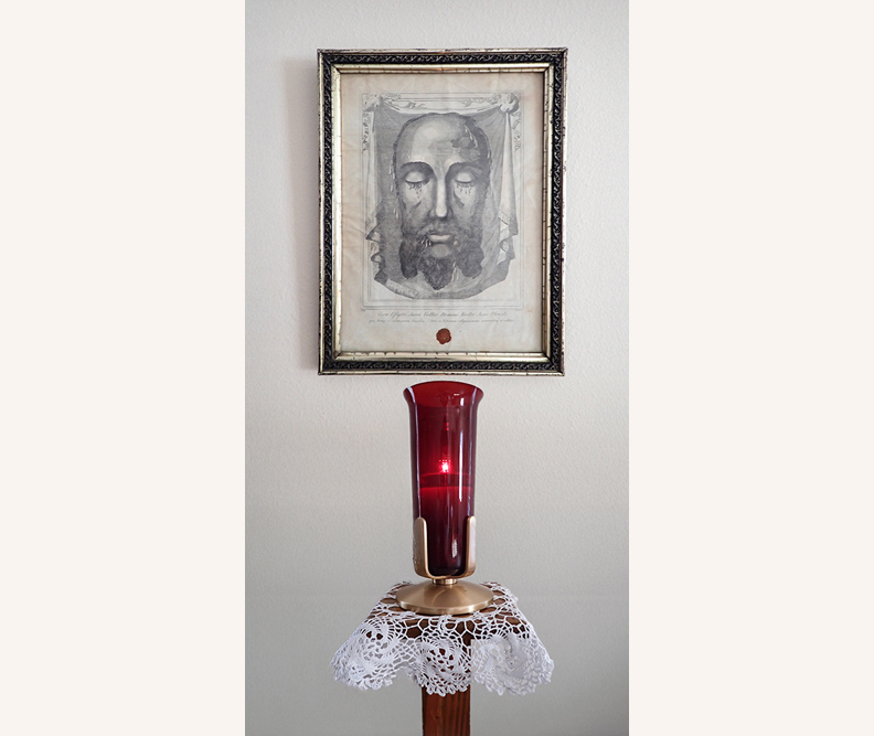 For the next 75 years, additional copies were made of the veil in the same manner and sent to churches and convents in order to promote and spread the devotion. This is the story behind our own image the veil’s image of the Holy Face in our own oratory. It is one of those early original drawings from the miracle. As we mentioned in our past newsletter, we received it as a gift from a good friend of our Community, and it bears the personal seal of Pope Pius IX. It is from this very image that we make the ancient Holy Face plaques that we offer to you. And today, as we begin The Holy Forty Days of Lent, we present a new relic badge. But the story behind the new badge goes a little deeper.